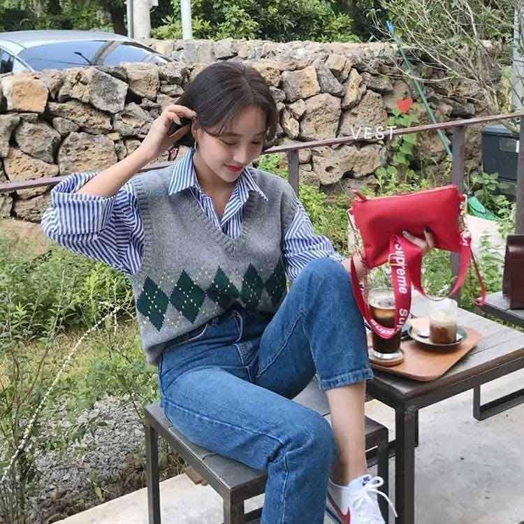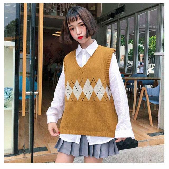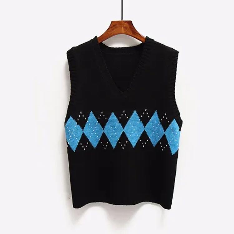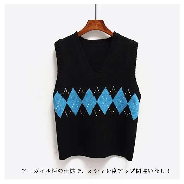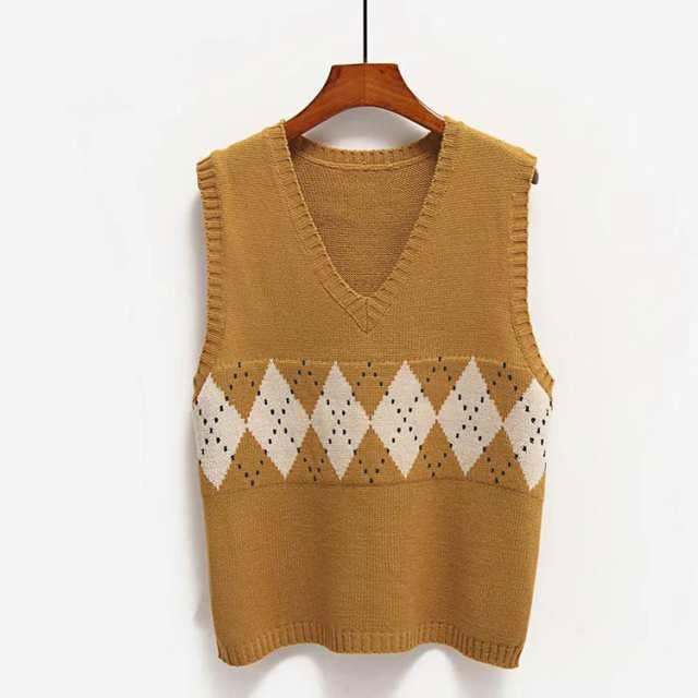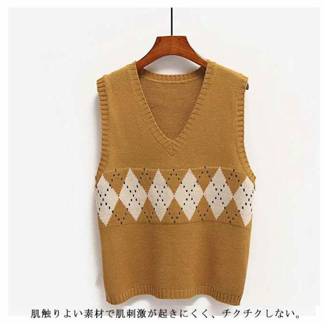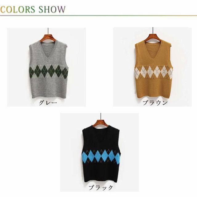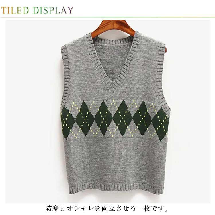 ニットベスト レディース ベスト 秋冬 ニット 重ね着 袖なし アーガイル柄 チェック おしゃれ 切り替え カジュアル プルオーバー ゆった Vネック