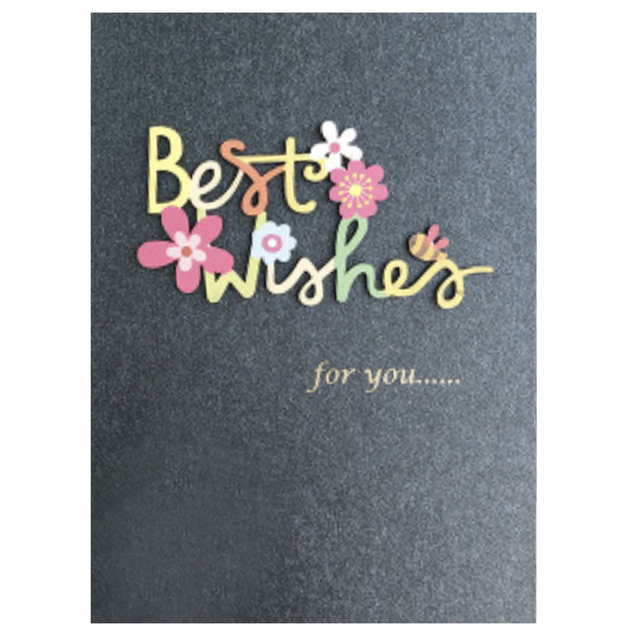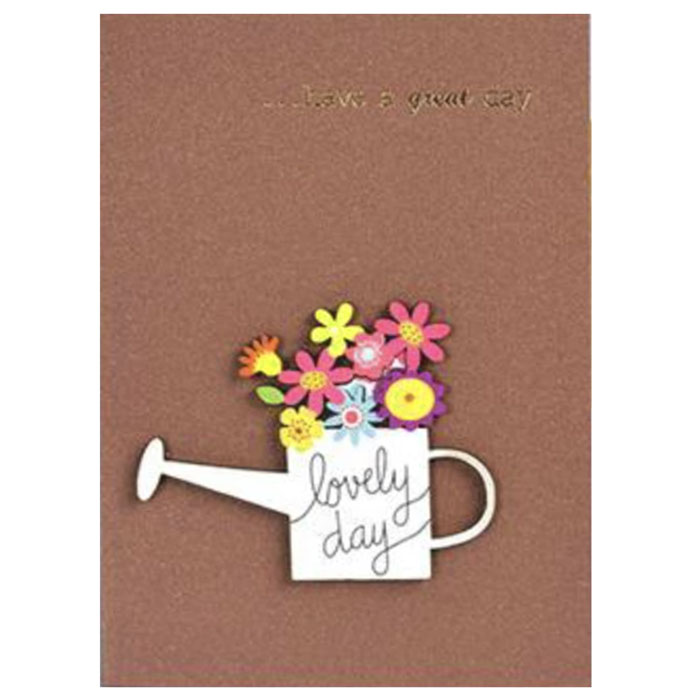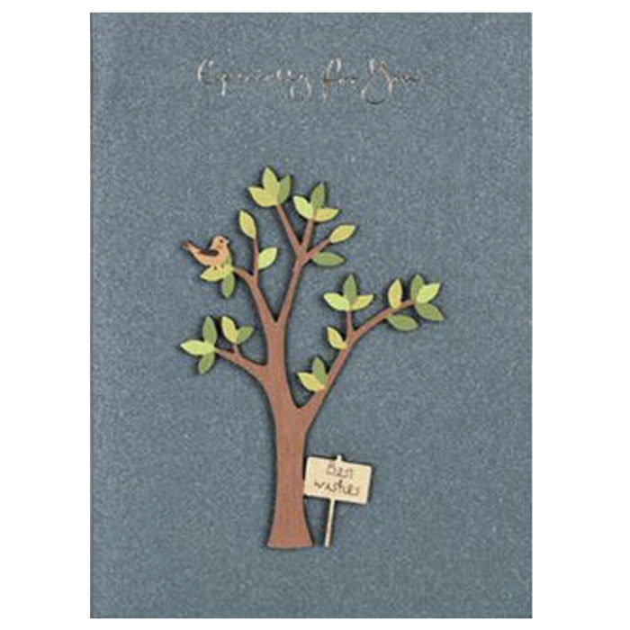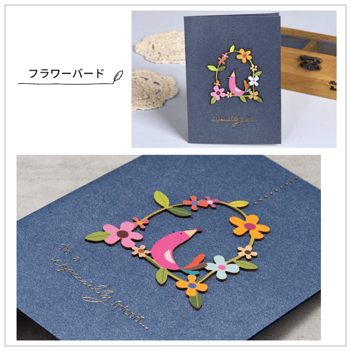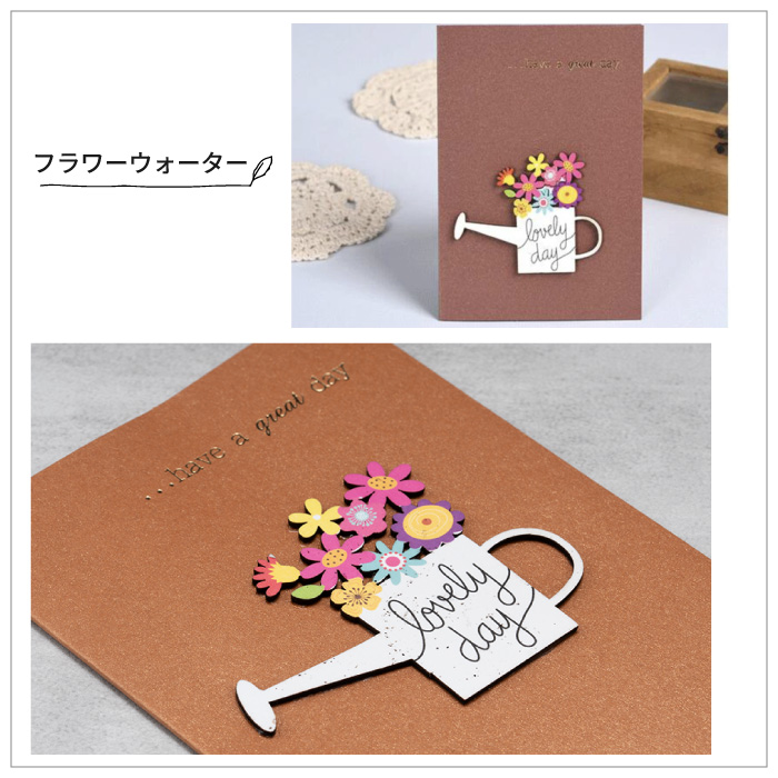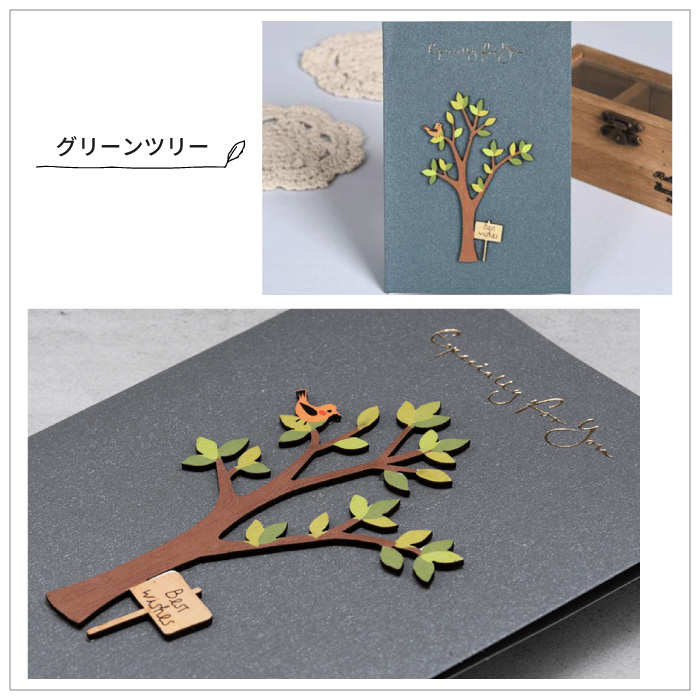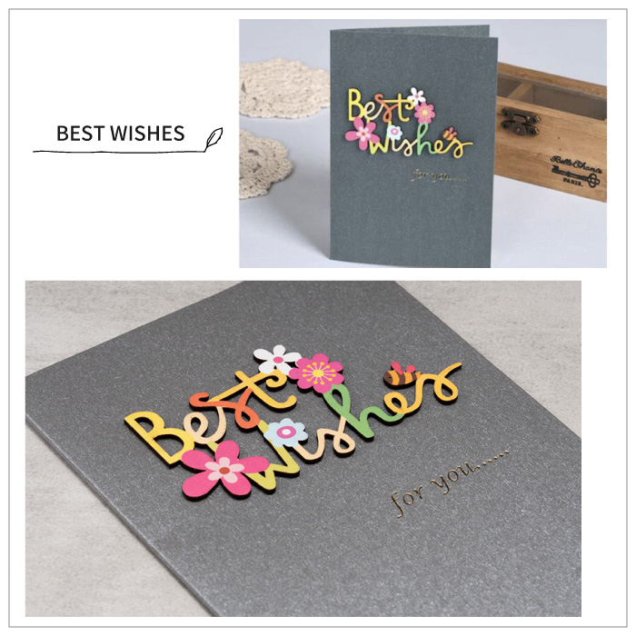 角度によって印象が変わる光沢のあるペーパーと、 木でできた立体的な文字やカラフルな絵柄が楽しいメッセージカード。